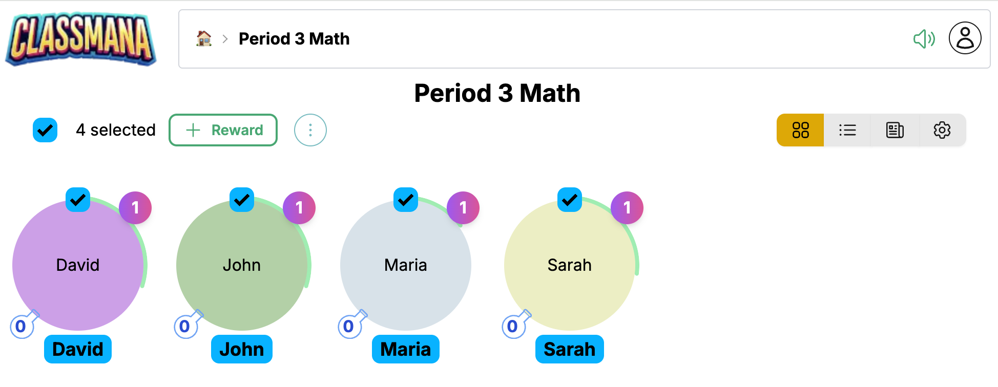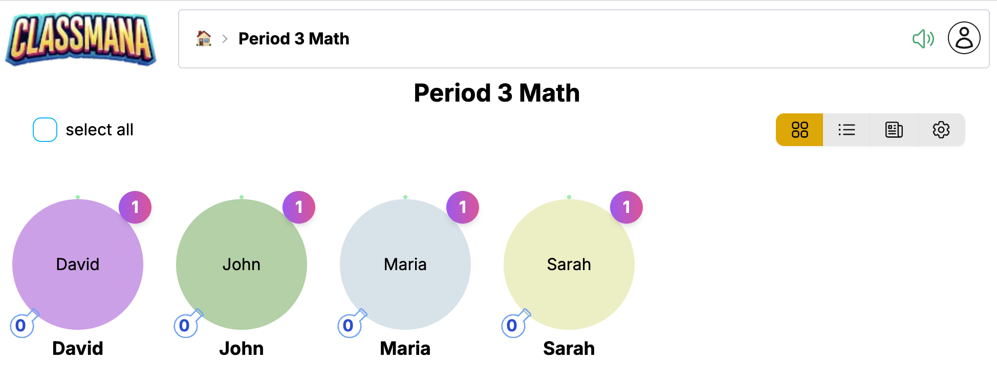 Използвайте квадратчето за отметка на всяка карта, за да изберете множество ученици, след което извършете групови действия:
