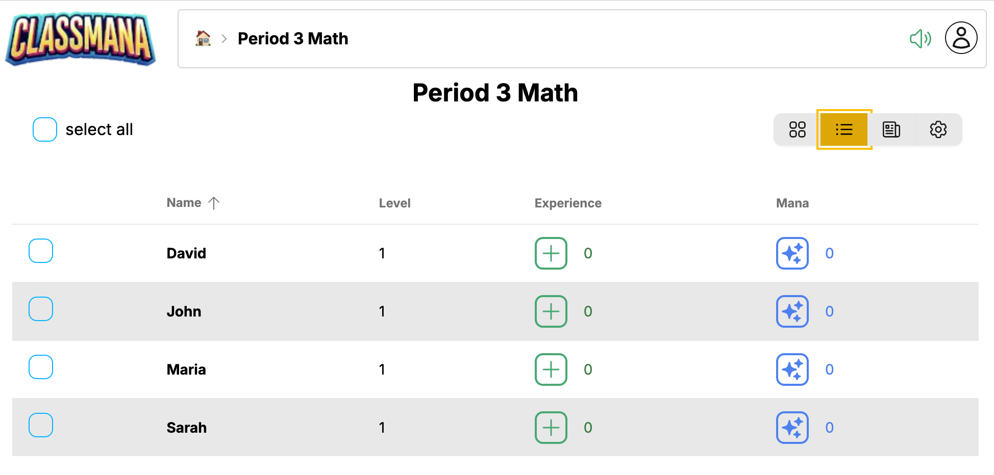Таблицата ученици предоставя компактен, подобен на електронна таблица изглед на вашия клас.