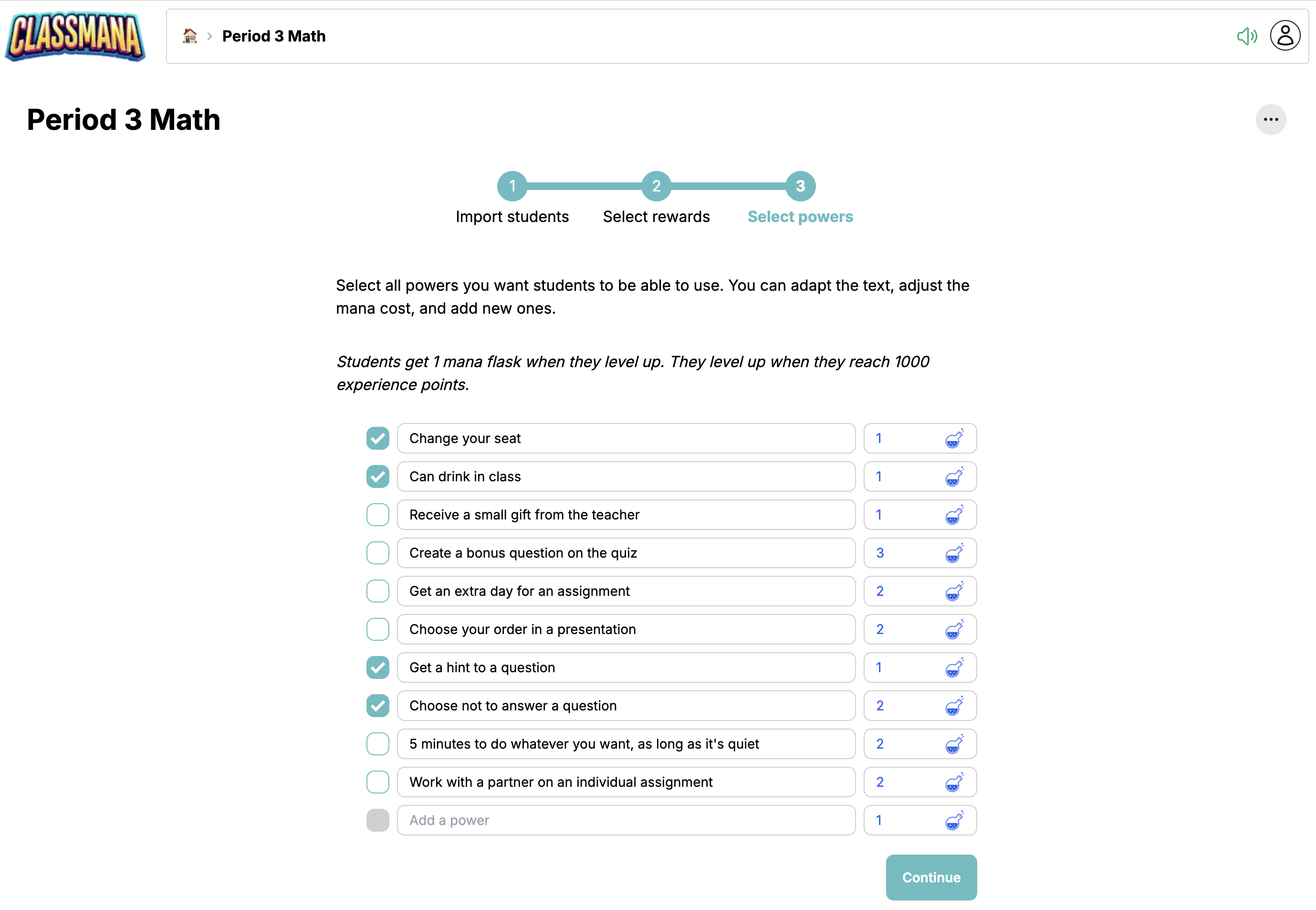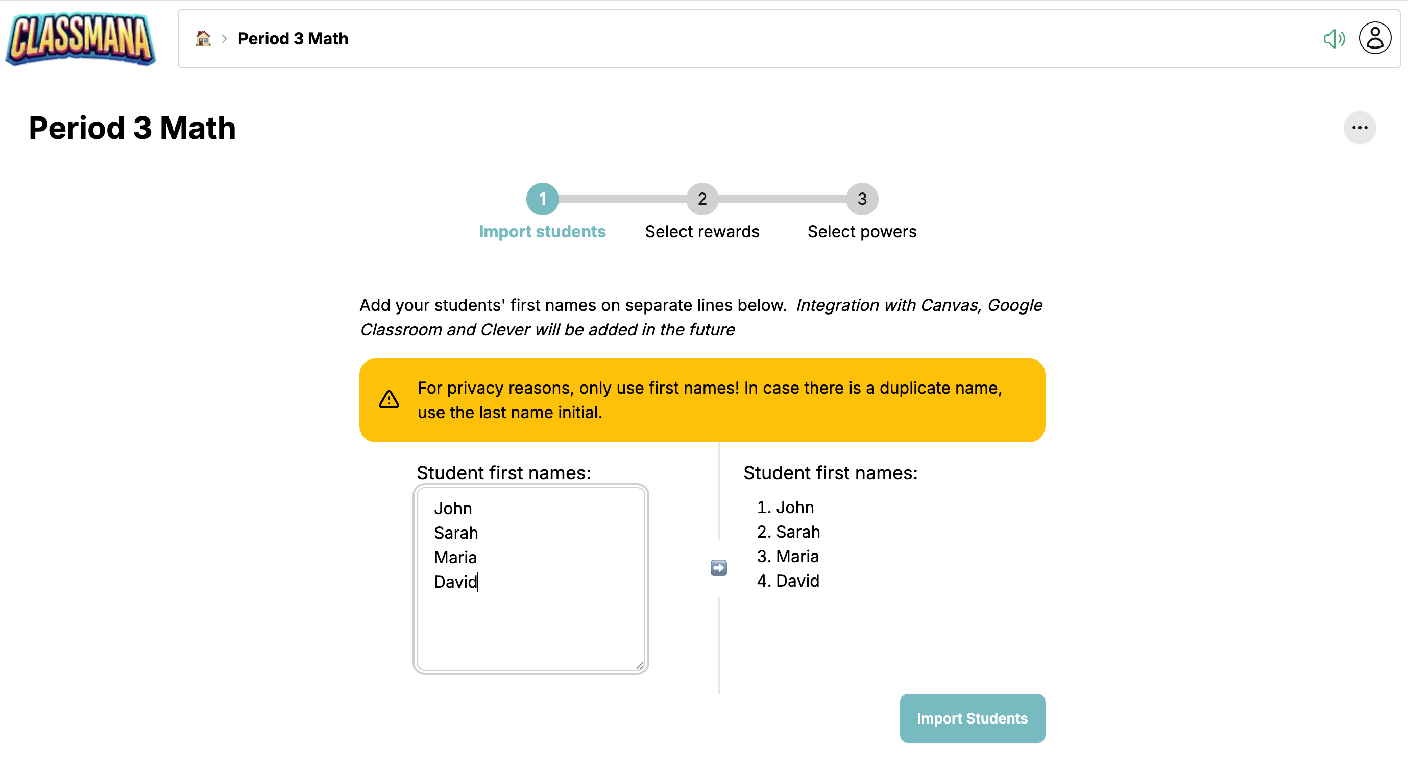 След създаването на вашия клас ще преминете през 3-стъпков съветник за настройка, за да конфигурирате ученици, награди и сили.