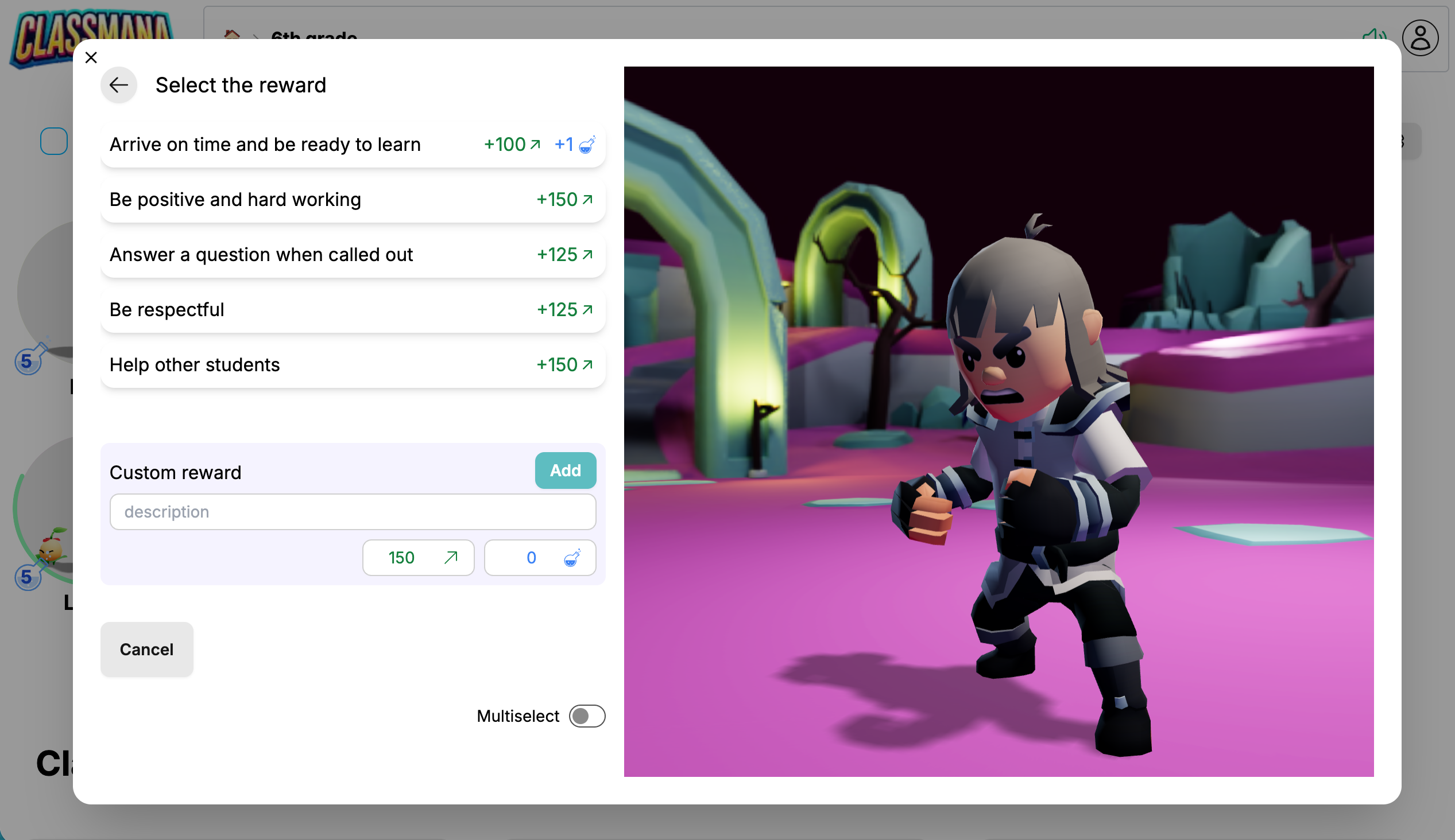 Панелът за награди работи по същия начин - кликнете върху предварително конфигурирана награда или създайте персонализирана. Наградата ще бъде приложена към всички избрани ученици.