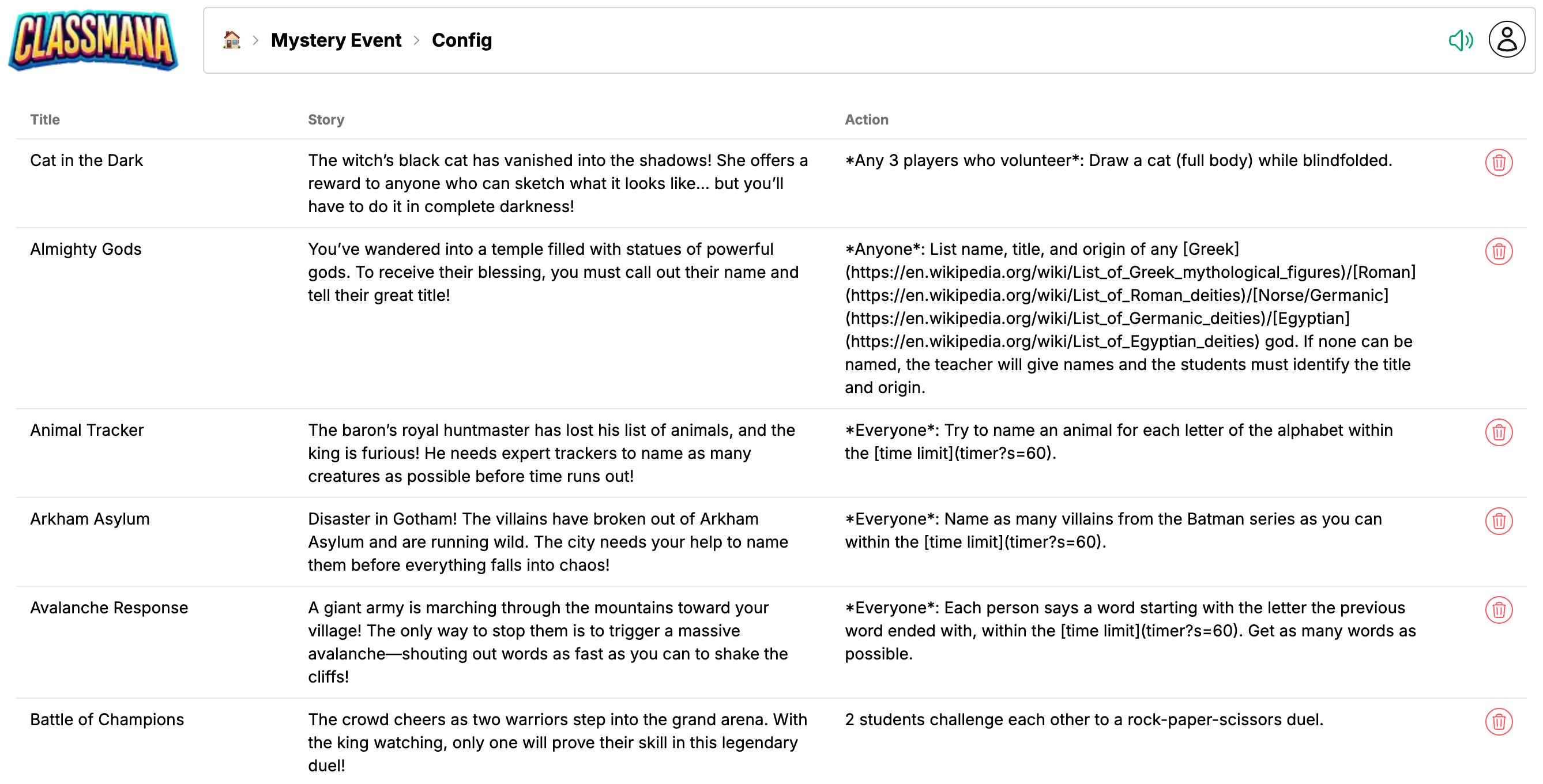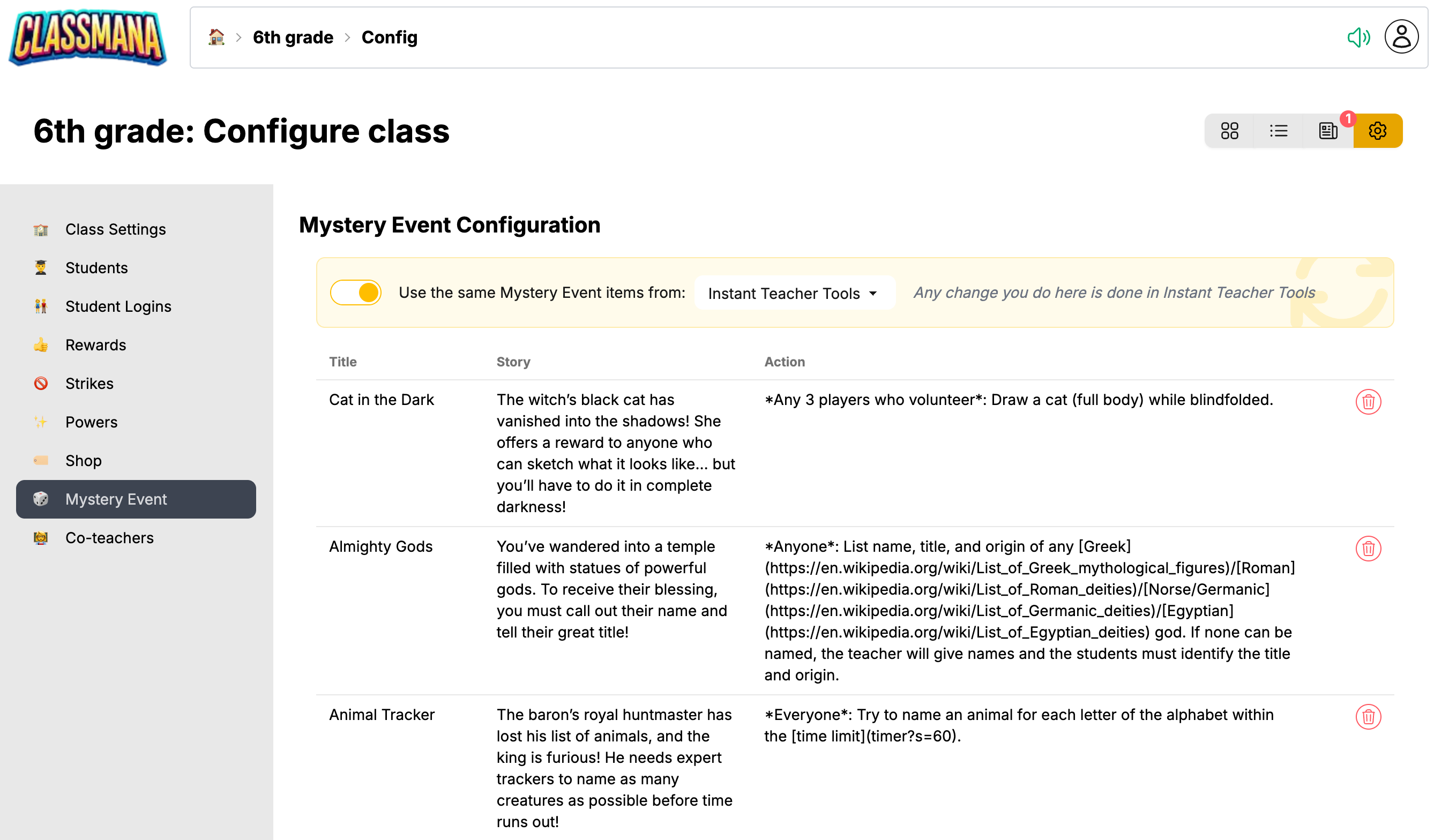 Когато използвате мистериозни събития от в рамките на клас, всеки клас може да има свой собствен набор от събития — или да ги синхронизира от друг клас. Достъпете го от конфигурацията на вашия клас под 🏠 Табло → Клас → ⚙️ Конфигурация → 🎲 Мистериозно събитие